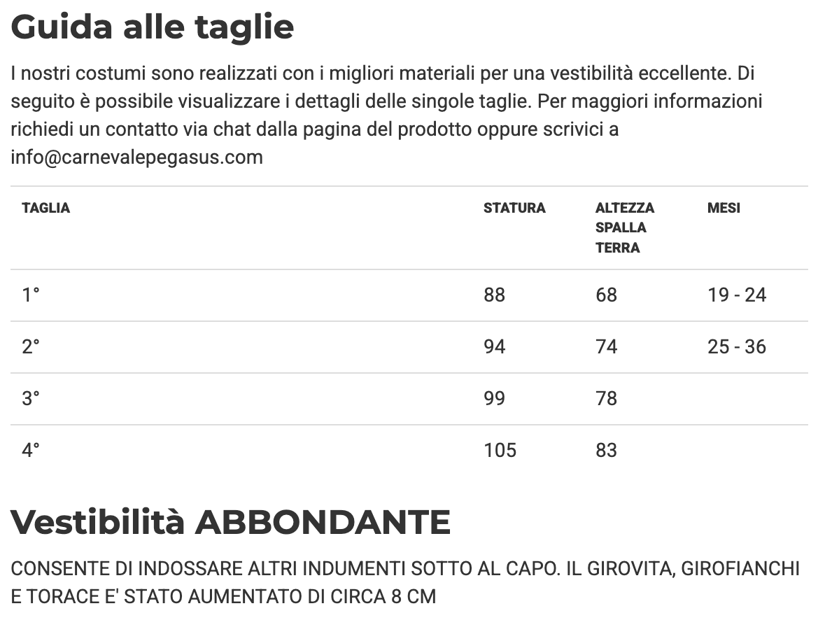 Confezionato nel pratico scatolo 8x26x32, all’interno presenti i seguenti elementi: VESTITO CON GREMBIULE INCORPORATO, FUSON, FRONTINO.