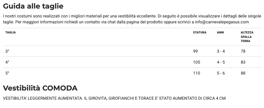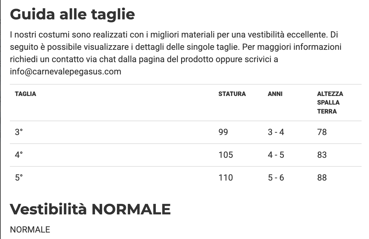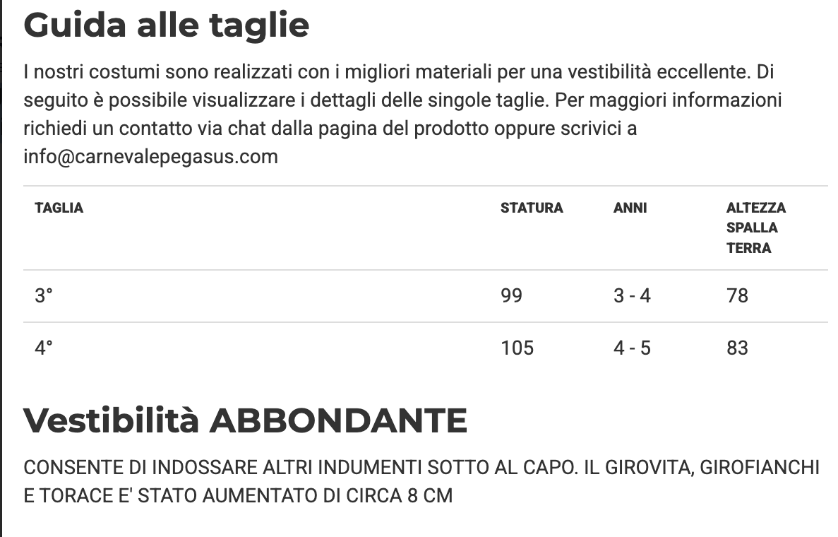 Il costume biancaneve è disponibile in 3 taglie a partire da 3° fino a 5°.