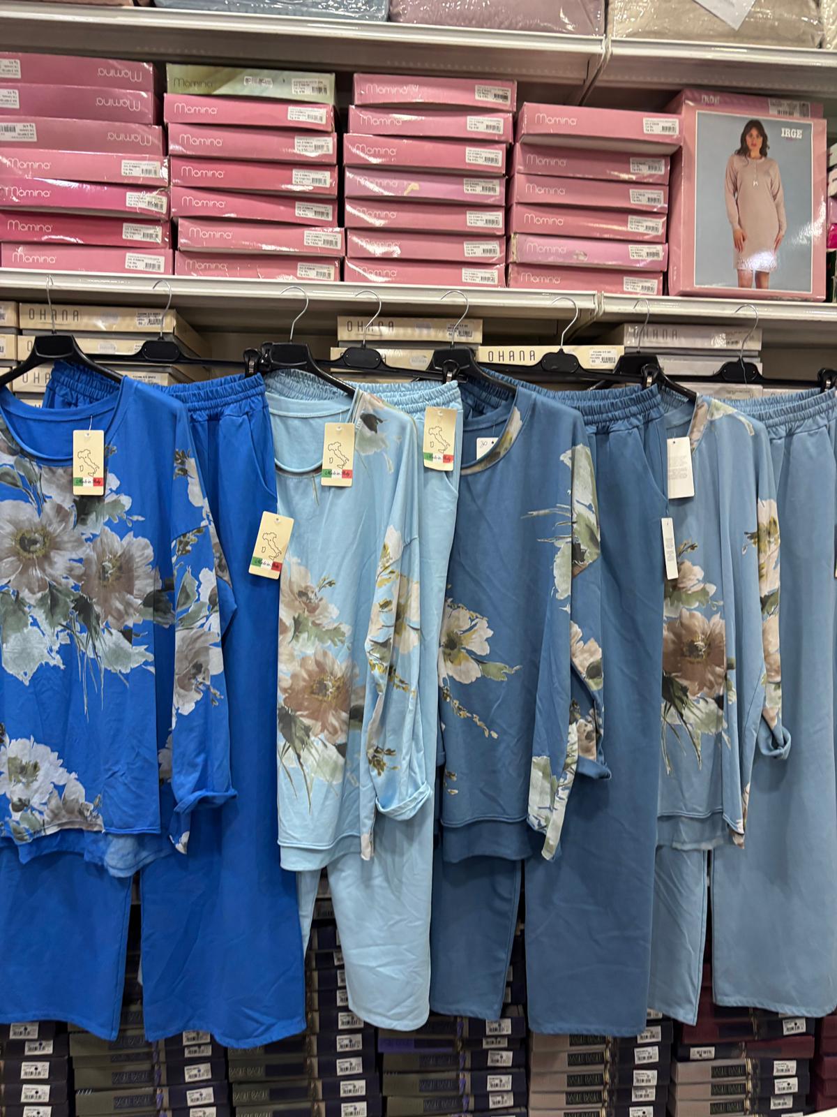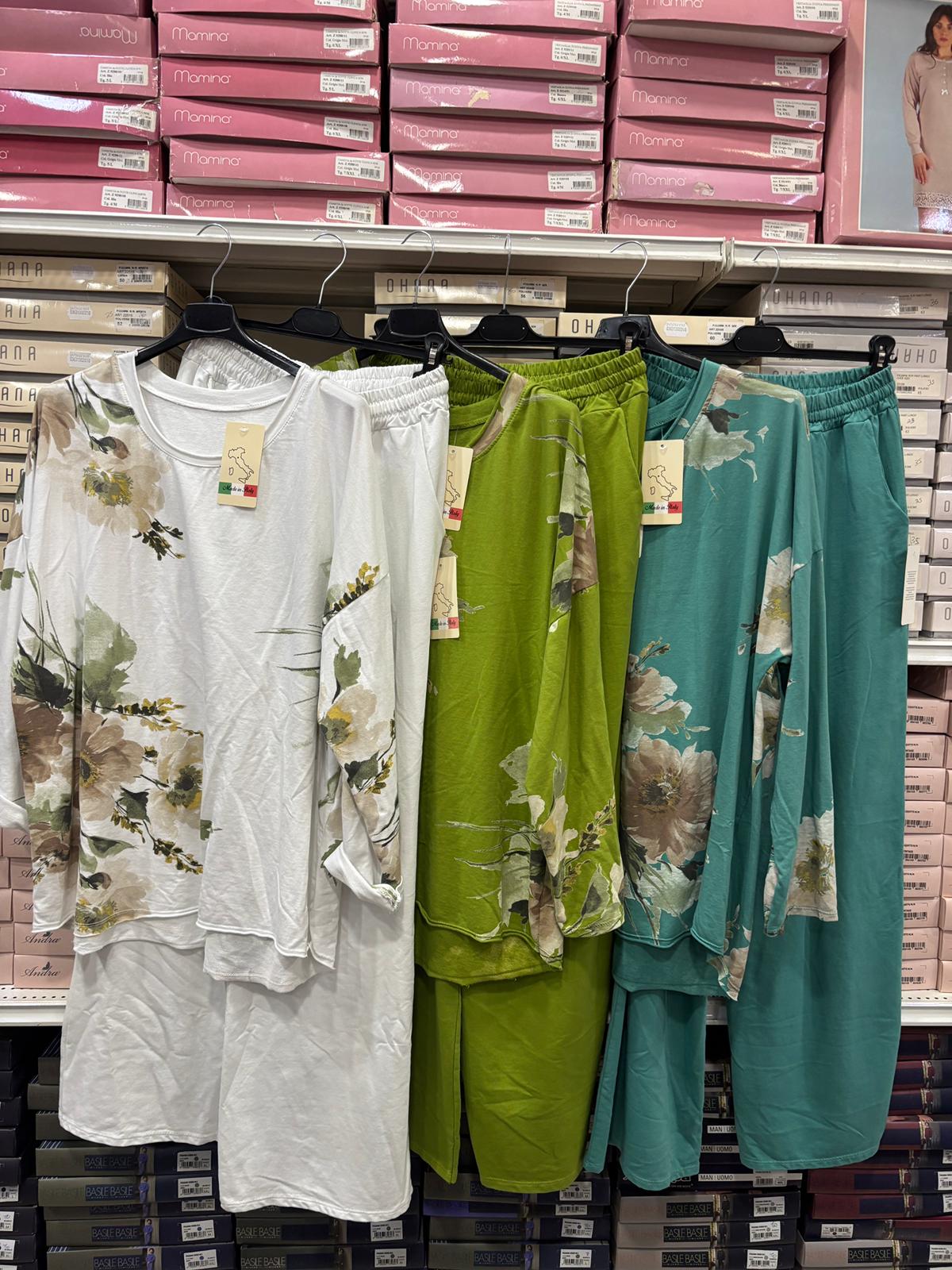 Completo marisol 3 pezzi33,00 €Il completo è composto da casacca georgette, top in cotone con pizzo e pantalone palazzo in viscosa