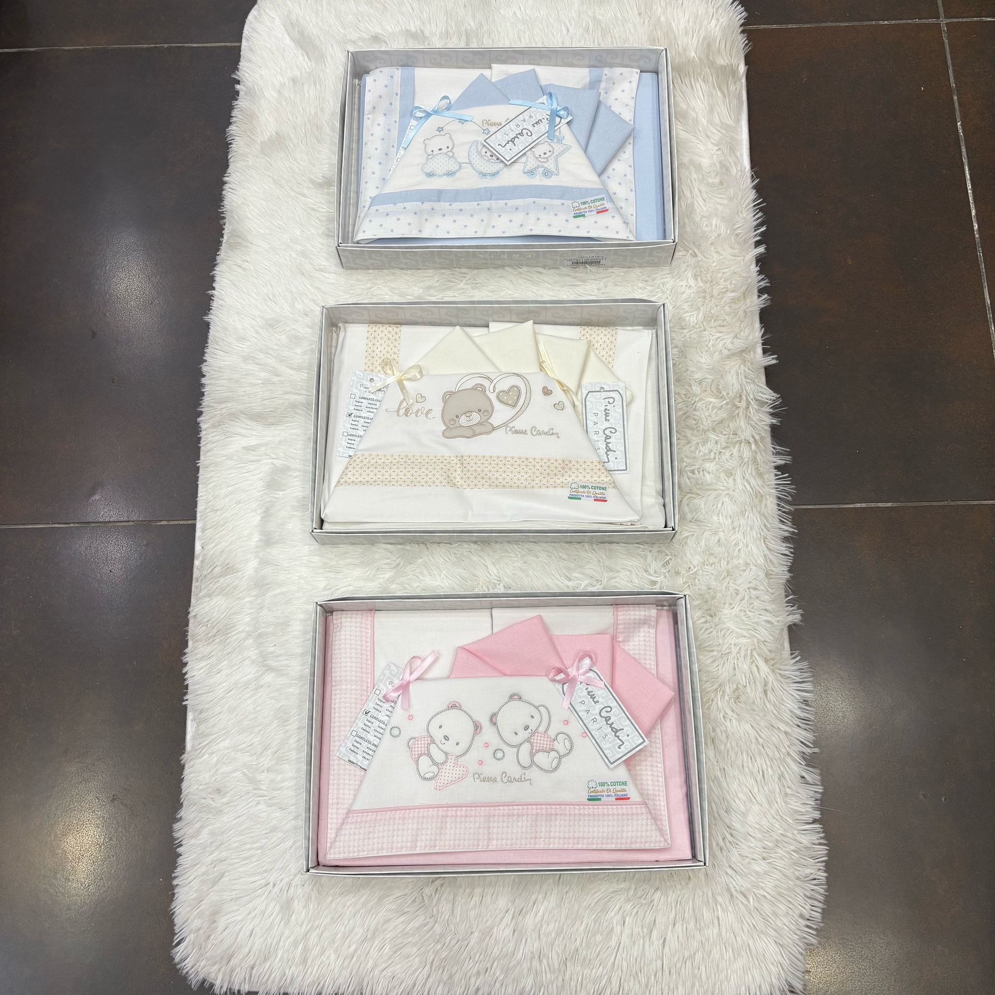Il set è disponibile in diverse varianti di colore: rosa, cielo, grigio e beige. Attenzione: Puoi scegliere il colore, ma la fantasia e la marca (irge, batuffolini) possono variare in base alla disponibilità.