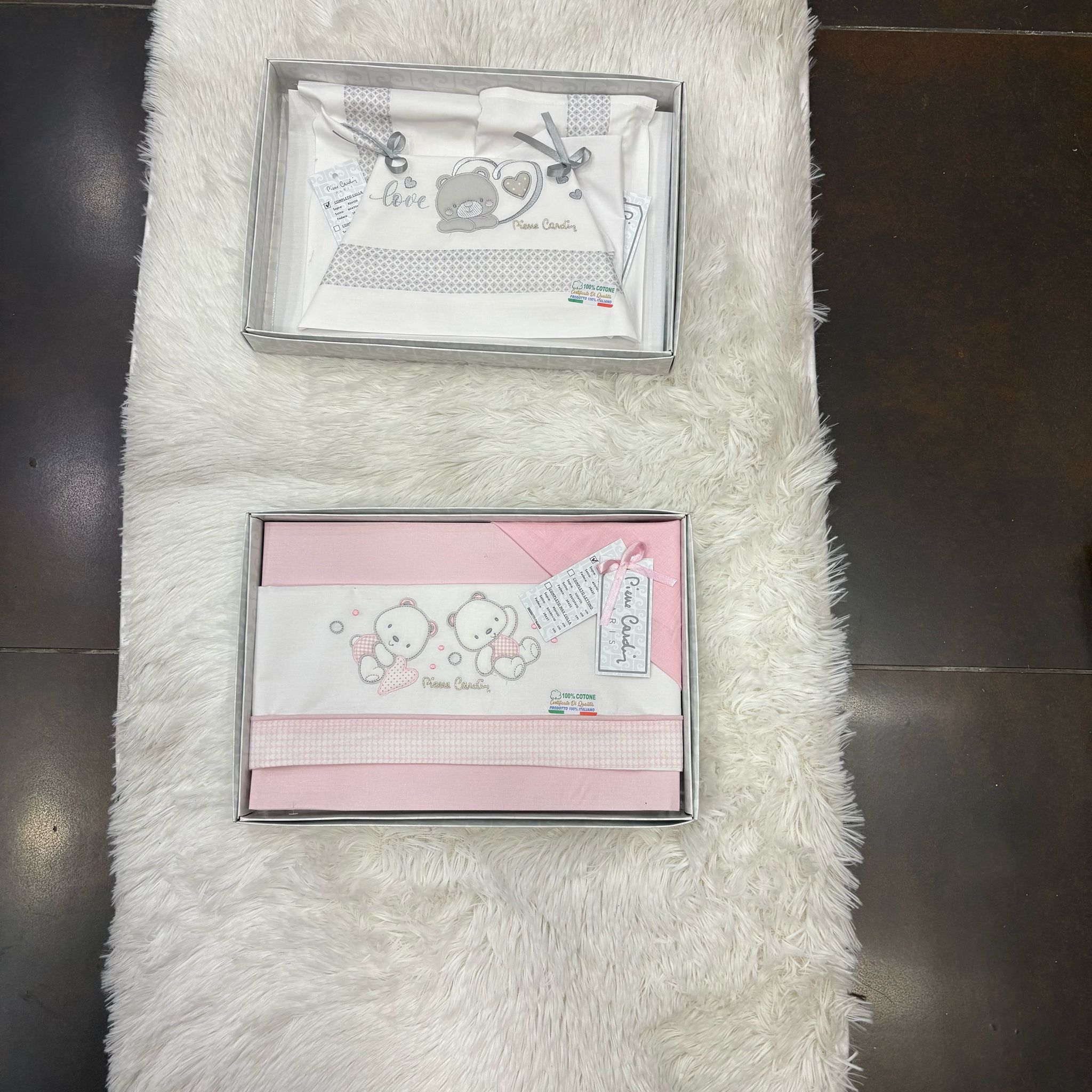 Il set è disponibile in diverse varianti di colore: rosa, cielo, grigio e beige. Attenzione: puoi scegliere il colore, ma la fantasia e la marca (irge, nazareno gabrielli, batuffolini) possono variare in base alla disponibilità.